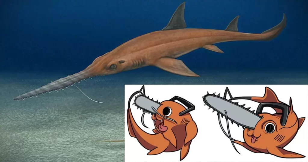 La semejanza de este personaje con los tiburones sierra —cuyo hocico se prolonga en una estructura dentada semejante a una motosierra— inspiró la creación del nuevo nombre, uniendo de manera creativa la paleontología con la cultura pop contemporánea.